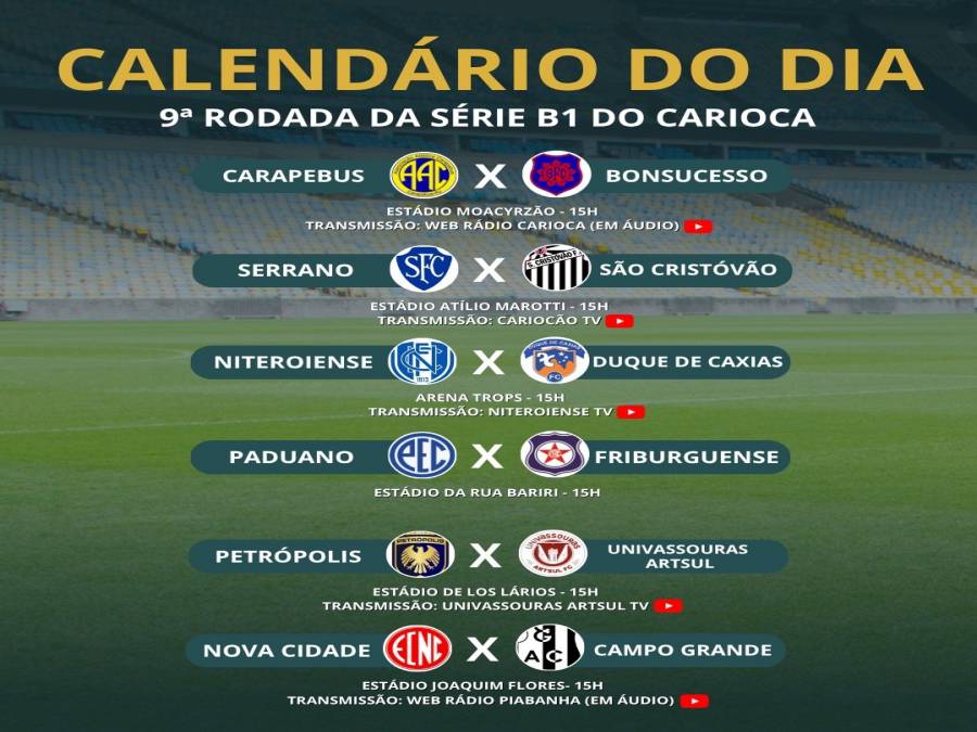 Acontece nesta quarta-feira a 9ª rodada da Série B1 do Campeonato Carioca. Ela estava prevista para semana passada, mas foi adiada devido a questões de segurança na cidade do Rio.