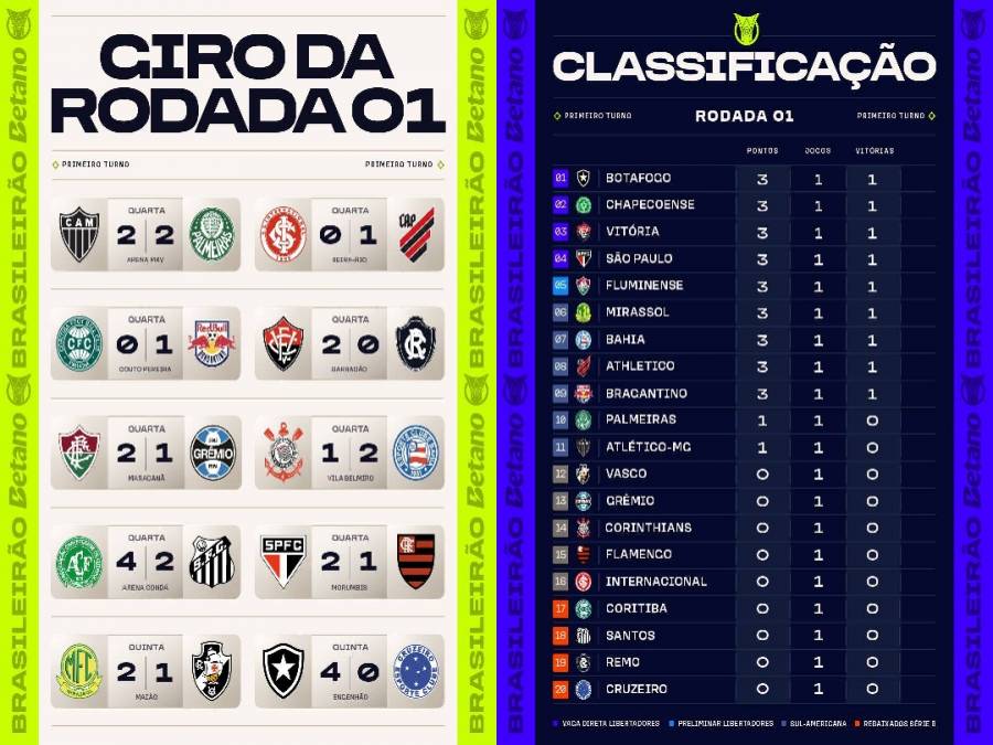 A primeira rodada do Brasileirão 2026 foi encerrada nesta quinta-feira com dois jogos. Em Mirassol, o time da casa venceu o Vasco por 2 a 1, de virada, enquanto no Rio de Janeiro o Botafogo construiu uma vitória expressiva por 4 a 0 sobre o Cruzeiro, resultado que colocou a equipe alvinegra na liderança da competição.