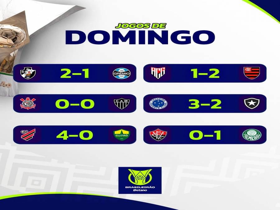 A primeira rodada do Campeonato Brasileiro acabou com seis jogos neste domingo. Favoritos ao título, Flamengo e Palmeiras estrearam com vitória. O Corinthians, por sua vez, empatou com o Atlético-MG. Cruzeiro e Vasco também venceram. Já o Athletico-PR fez sonoros 4 a 0 no Cuiabá.