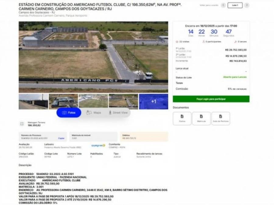 De acordo com as informações publicadas na plataforma de leilões, o terreno, localizado na Avenida Professora Carmem Carneiro, em Campos dos Goytacazes (RJ), tem uma área total de 198.350,62m² e inclui o Centro de Treinamento e o estádio que está sendo construído.