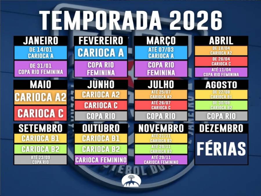 A FERJ divulgou o calendário esportivo para a temporada de 2026. A primeira competição profissional do ano será a Série A do estadual, com início no dia 14 de janeiro e término em 7 de março.